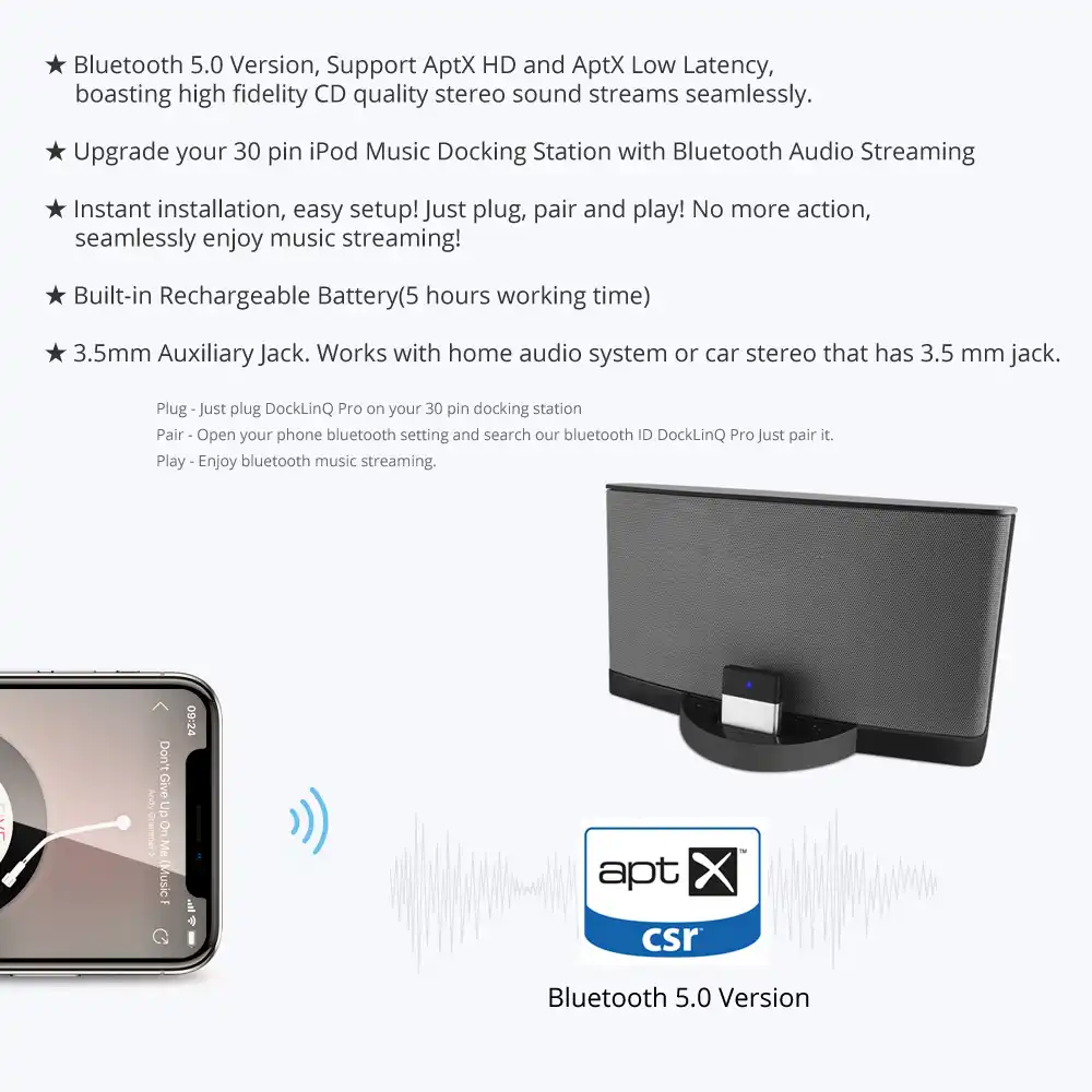 Docklinq Pro Bluetooth 5 0 Aptx Low Latency Adapter Receiver For Bose Sounddock And 30 Pin Music Docking Station